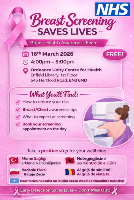 As part of our ongoing commitment to encourage patient participation in NHS cancer screening programmes, our team has arranged a Breast Health Awareness Event at the Ordnance Unity Centre Library.