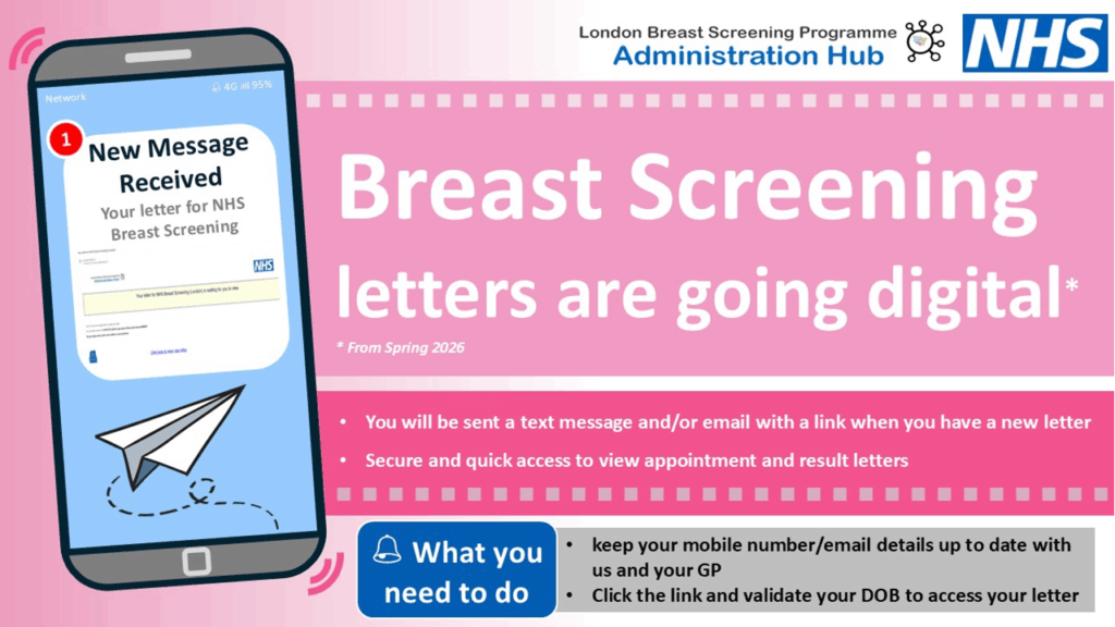 From 15th January 2026, the NHS London Breast Screening Programme will begin a phased roll-out of making breast screening letters top patients digital. Patients with a valid email or mobile number recorded, will be able to receive and view their NHS Breast Screening appointment and results letters instantly on their smartphone, tablet, or computer through a secure link sent via text message or email. For general information about the importance of breast screening, please visit our breast screening webpage.